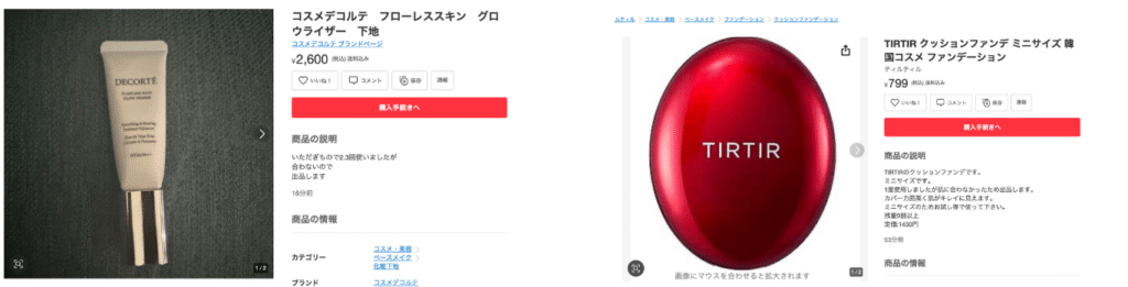 出品者側の出品理由も「匂いが苦手だった」「肌に合わなかった」など、使わなくなった正当な理由があるケースが多く、ニーズとマッチして取引が活発に行われています。また化粧品は重量が軽いため、送料が安く済むことも物販初心者におすすめできるポイントのひとつです。