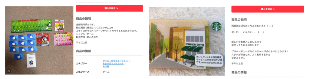 ただし、電子ギフト券や現金そのもの(外貨含む)の売買は、メルカリの規約で禁止されているため、間違って出品しないようにしてください。
