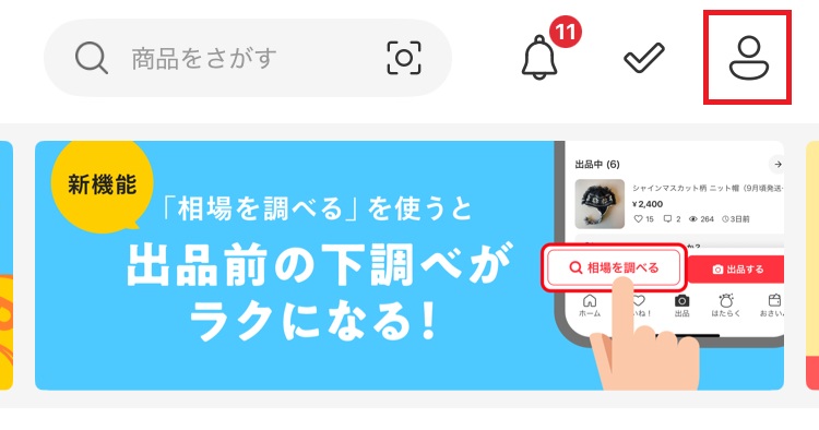 メルカリアプリを開き、画面右上のマークをタップ