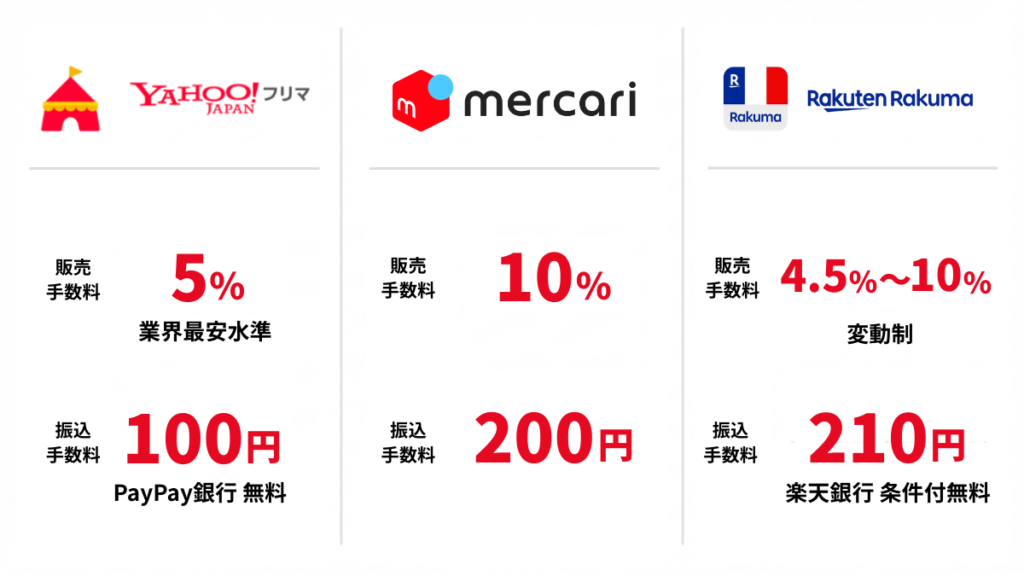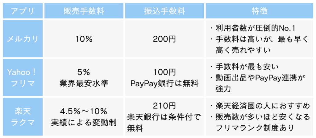 「メルカリ」「Yahoo!フリマ」「楽天ラクマ」には、それぞれ「売れやすさ」や「手数料」に明確な強みがあります。