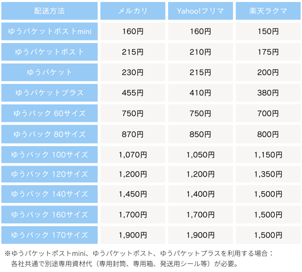 (メルカリ:ゆうゆうメルカリ便 / Yahoo!フリマ:おてがる配送 / 楽天ラクマ:かんたんラクマパック)
