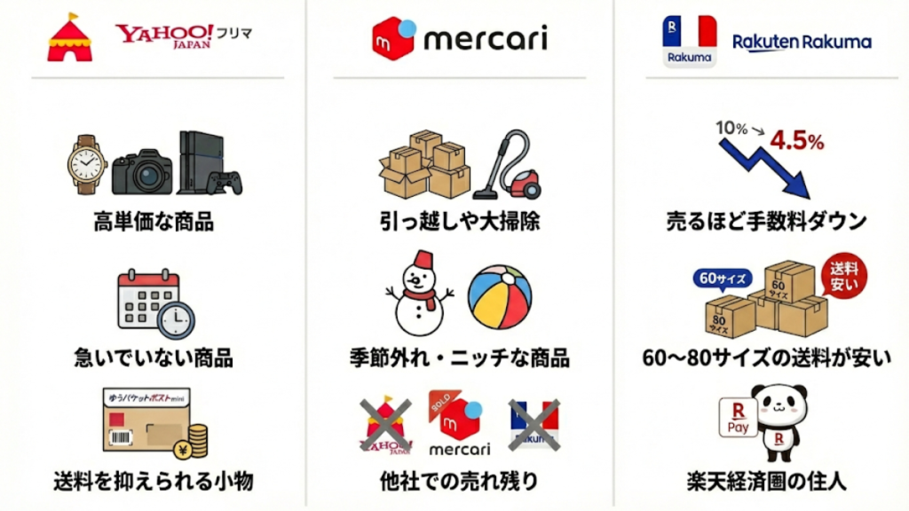「高単価はYahoo!フリマ、かさばるセットは楽天ラクマ」など、商品の特徴に合わせて使い分けるのが正解。