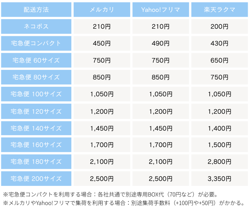 (メルカリ:らくらくメルカリ便 / Yahoo!フリマ:おてがる配送 / 楽天ラクマ:かんたんラクマパック)