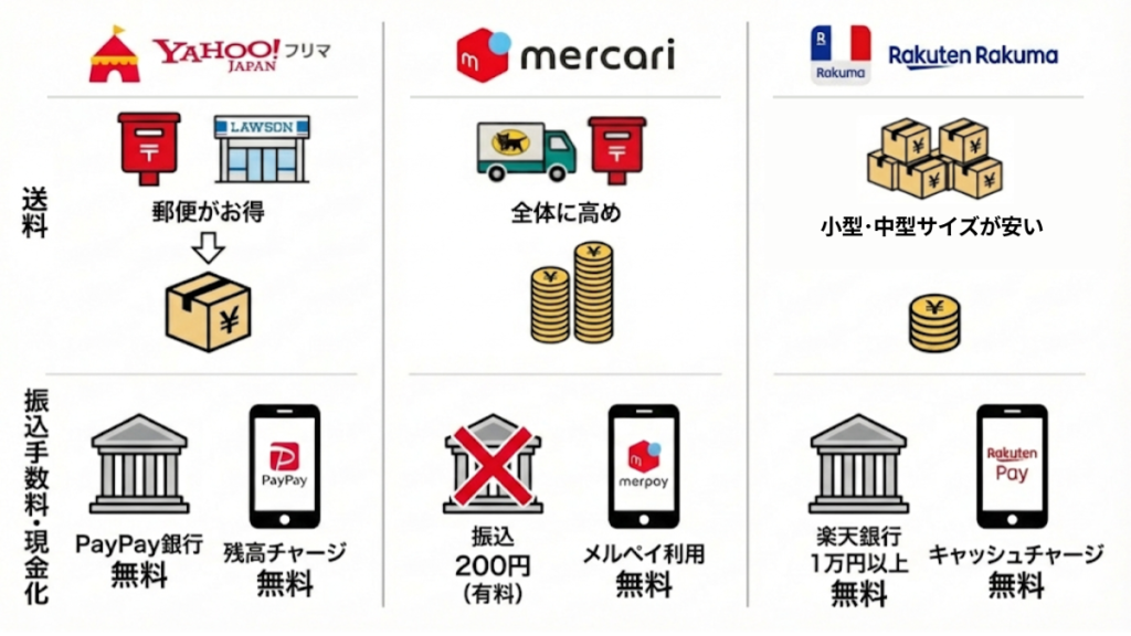 メルカリ、Yahoo!フリマ、楽天ラクマ、それぞれの「手数料」や「送料」の違いを知っているだけで、手元に残る利益は確実に変わります。