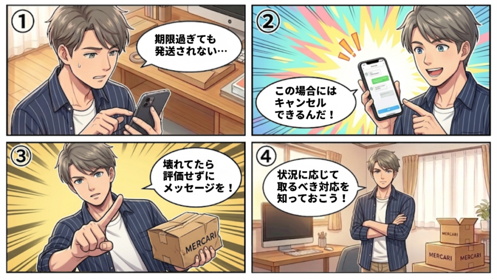 設定された「発送までの日数」を過ぎても発送されない場合のみ、例外として購入者側からキャンセル手続きができる。 - 取引メッセージでの話し合いが必要なケース