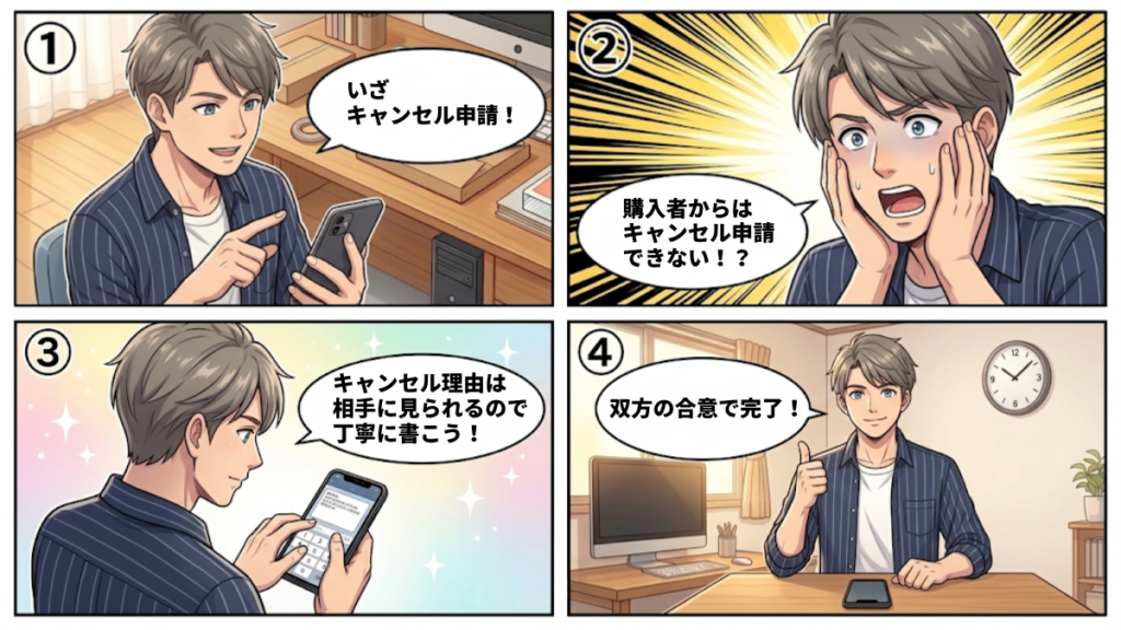 さらに重要な点として、購入者側の画面にはキャンセル申請のボタンが表示されないため、自分から手続きを進めることができません。