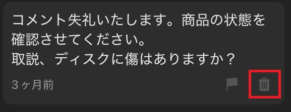 通常、出品者がコメントを削除すると「出品者がコメントを削除しました」という表示が残り、痕跡は完全に消せません。痕跡が残るため、どうしてもコメントを消したことが周りに伝わってしまいます。