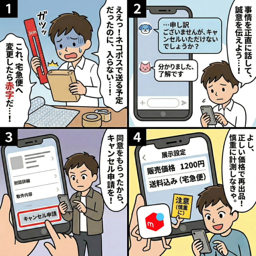 発送後のサイズ変更などで送料が確定したタイミングで利益0円が判明するため、事前の正確な計算が重要です。
