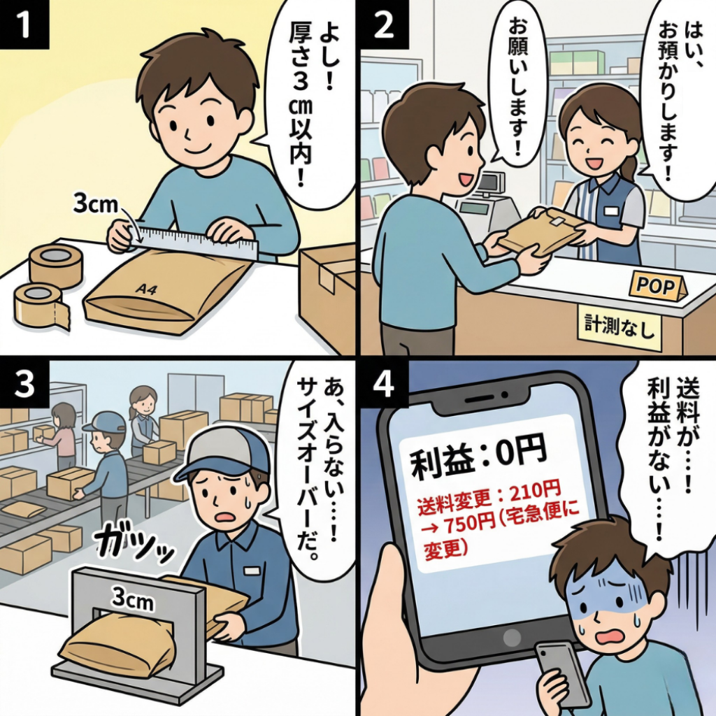 発送手続きをコンビニで行う場合、レジではサイズ計測が行われない点に注意が必要です。