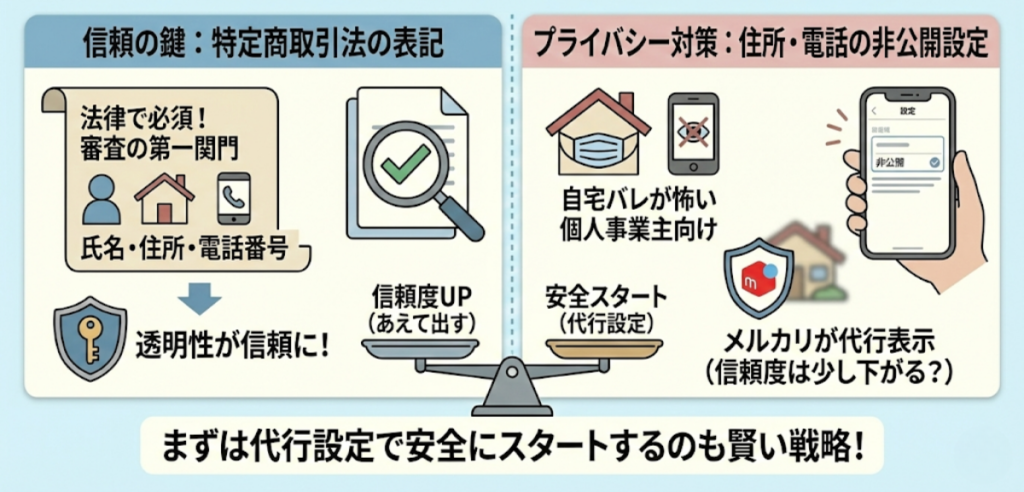 Shopsは「特定商取引法」により、運営者の住所・電話番号の開示が原則必要ですが、設定で非公開(メルカリ情報を代行表示)にできます。