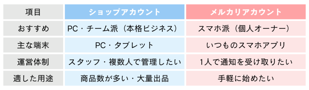 開設時は、運営スタイルに合わせて「ショップアカウント」と「メルカリアカウント」の2つから選べます。