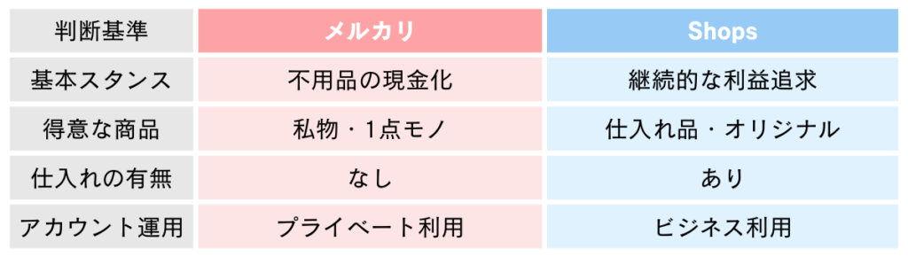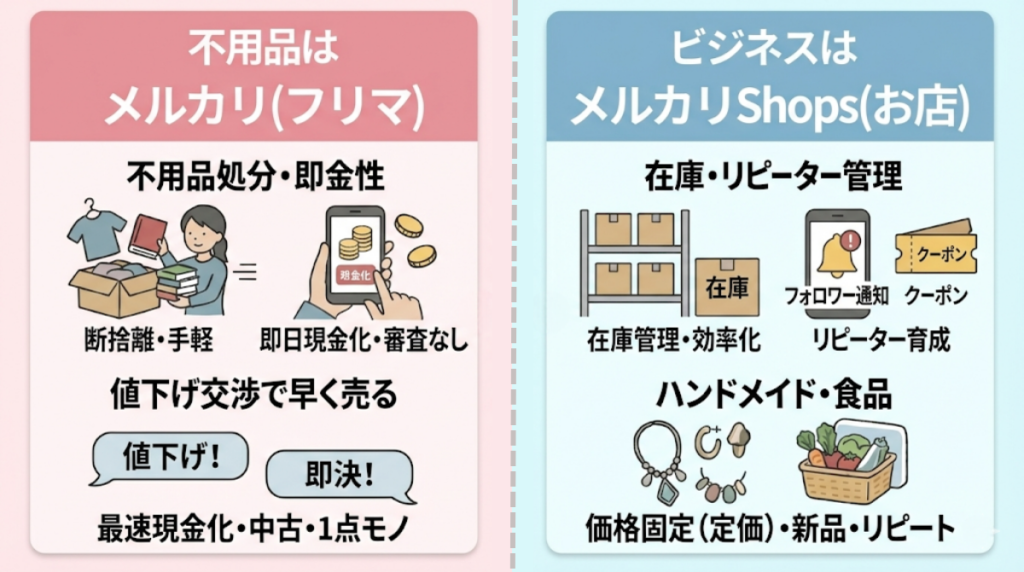 「家にある要らないものを売るならメルカリ」、「売るために商品を仕入れたならShops」。