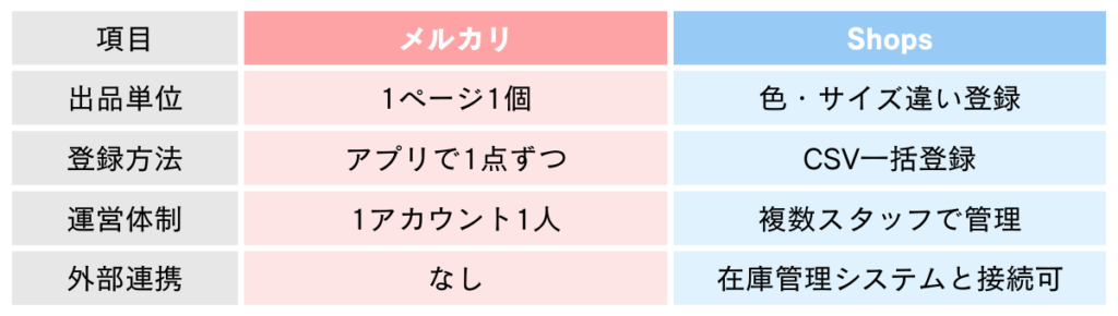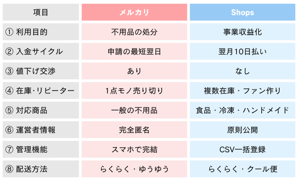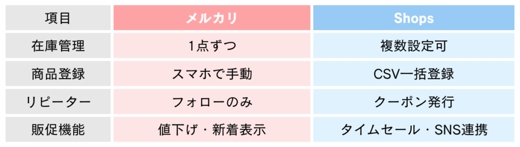 メルカリは「スピード重視」、Shopsは「ファン作り重視」といったように、「商品が売れる仕組み」にも大きな違いがあります。