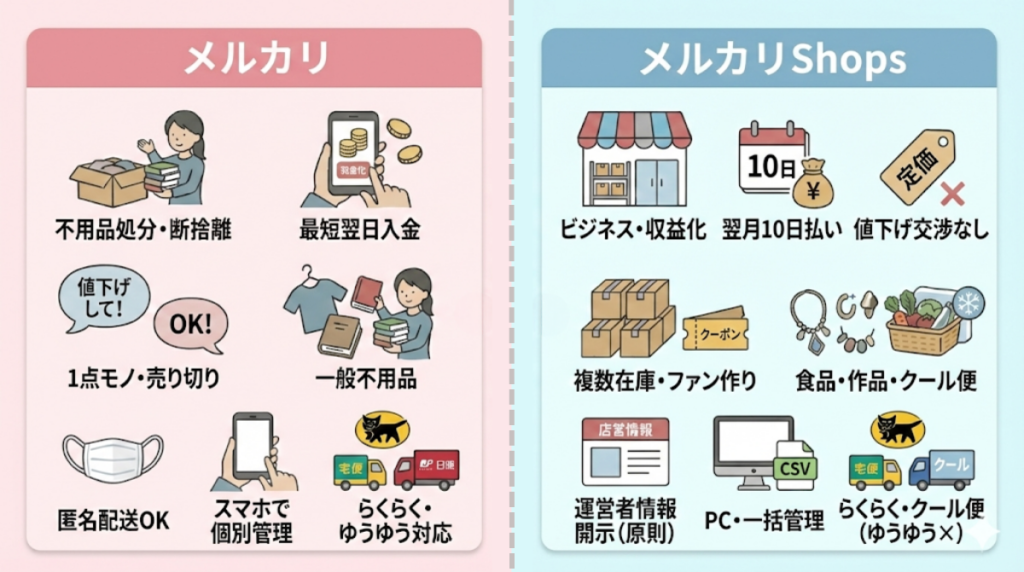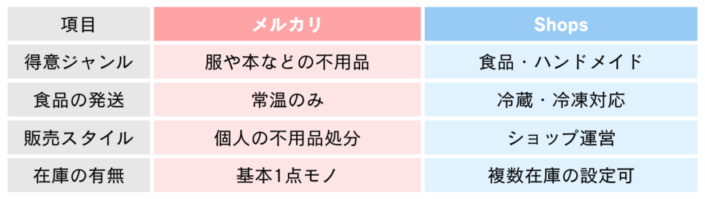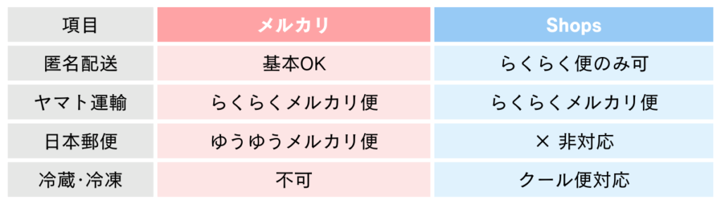 特に大きな違いは、Shops限定で使える「クールメルカリ便(冷蔵・冷凍)」の存在です。
