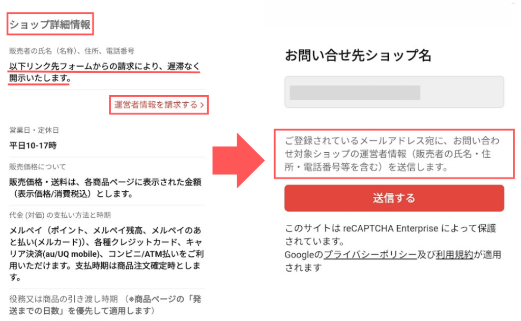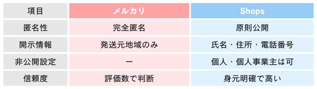 メルカリは「匿名」が基本ですが、Shopsはビジネス利用のため、法律(特定商取引法)により運営者情報の開示が原則必要です。
