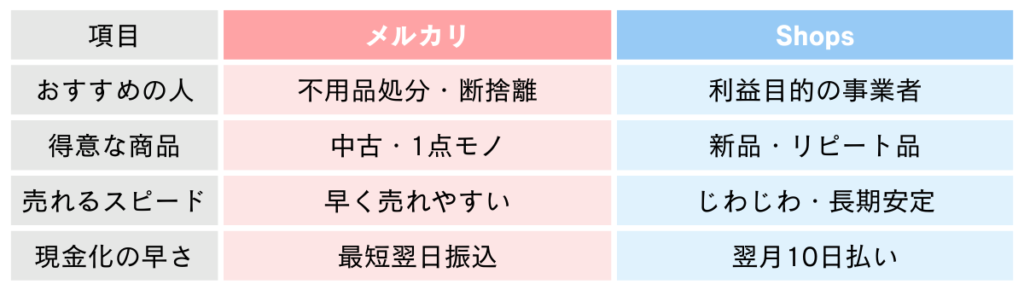 一言で言えば、1点モノの不用品を素早く現金化したいなら「メルカリ」、在庫を持って利益を積み上げたいなら「メルカリShops」がおすすめです。