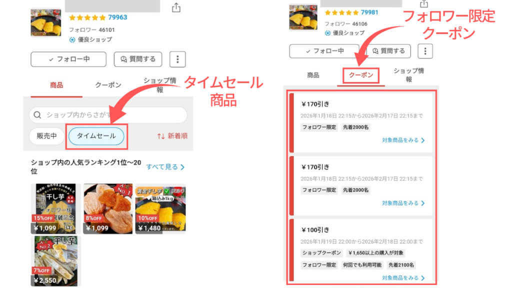実際に、以下のようなタイムセールやクーポンを使い、購入のきっかけを提供しているShopsが多く見つかりました。