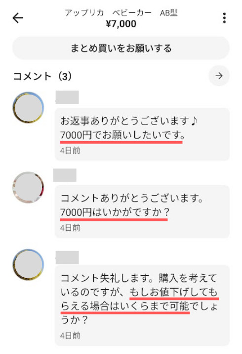 メルカリでは、以下のような価格交渉を経て購入されるケースが少なくありません。