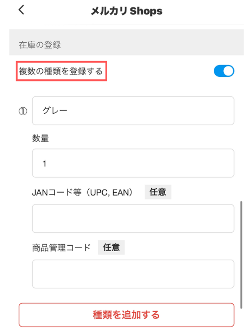 以下のShopsの在庫管理の画面からも、色や数などを選択し、複数の商品を登録できると分かります。