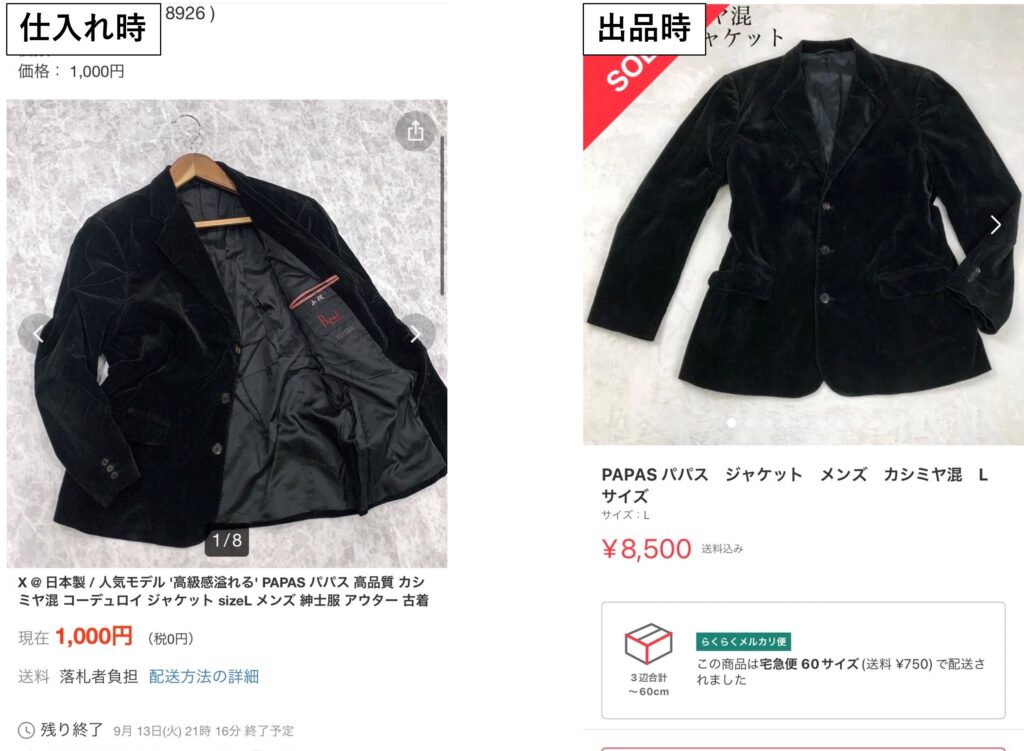 参考までに、過去に1,000円で仕入れて8,500円で販売したアウターを共有します。