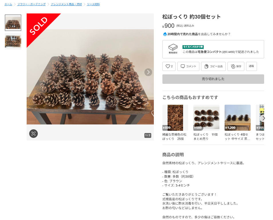 販売価格のほとんどが利益になるビジネスモデルと言えるでしょう。実際にメルカリでは、松ぼっくりが900円で販売されていました。