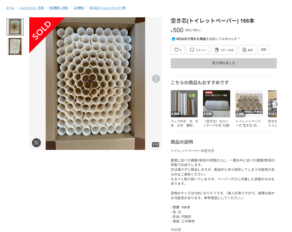 販売のコツは、同じ種類のものを数十個単位でまとめて出品することです。実際に、メルカリではトイレットペーパーの空き芯166個が500円で販売されていました。
